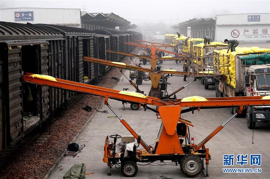 在中國鐵路鄭州局集團有限公司開封車站,工作人員使用傳輸機裝運春耕物資(2月13日攝)。新華社記者 李安 攝