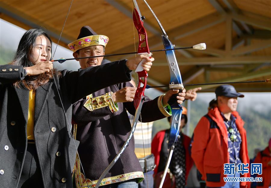 一名游客在當?shù)剞r(nóng)牧民的指導下射擊響箭(7月26日攝)。新華社記者 張汝鋒 攝