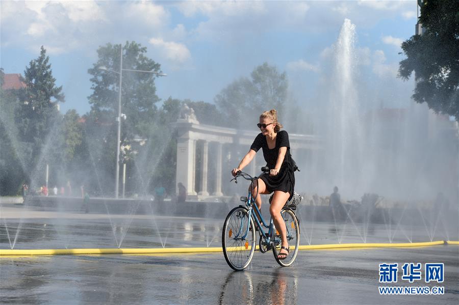 7月28日,在奧地利維也納,一名女子騎車經(jīng)過(guò)一處廣場(chǎng)的噴水設(shè)施。當(dāng)日,維也納市中心的最高氣溫達(dá)到37.2攝氏度,不少市民戲水消暑。新華社記者郭晨攝