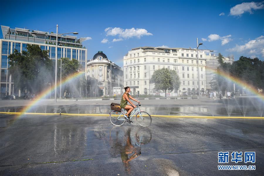 7月28日,在奧地利維也納,一名女子騎車經(jīng)過(guò)一處廣場(chǎng)的噴水設(shè)施。新華社記者郭晨攝