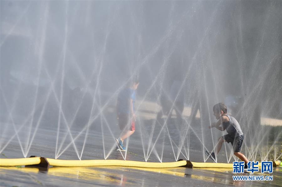 7月28日,在奧地利維也納,孩子在一處廣場(chǎng)戲水。新華社記者郭晨攝
