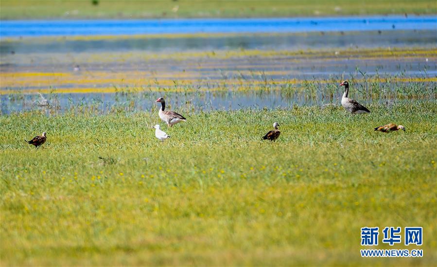 7月28日,灰雁和遺鷗在桃力廟—阿拉善灣海子覓食。鄂爾多斯?jié)竦匚挥趲觳箭R沙漠、毛烏素沙地接壤地帶,2002年被列入國際重要濕地名錄。從2006年開始,由于濕地湖面萎縮、湖心島消失,在此筑巢繁殖的世界瀕危物種遺鷗幾近消失。近年來,當(dāng)?shù)夭扇《喾N治理措施,濕地生態(tài)環(huán)境逐步好轉(zhuǎn)。2019年起,濕地內(nèi)的桃力廟—阿拉善灣海子迎來遺鷗大規(guī)?!盎貧w”。如今,40多種鳥類在此棲息,鄂爾多斯?jié)竦刂匦鲁蔀轼B類的樂園。新華社記者彭源攝