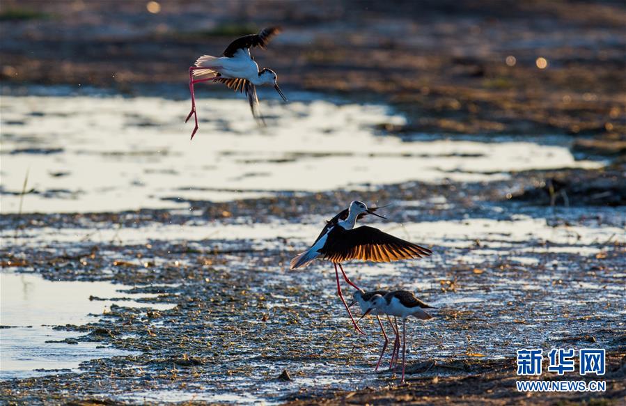 7月28日,在鄂爾多斯?jié)竦靥伊R—阿拉善灣海子,兩只長腳鷸在爭斗。鄂爾多斯?jié)竦匚挥趲觳箭R沙漠、毛烏素沙地接壤地帶,2002年被列入國際重要濕地名錄。從2006年開始,由于濕地湖面萎縮、湖心島消失,在此筑巢繁殖的世界瀕危物種遺鷗幾近消失。近年來,當(dāng)?shù)夭扇《喾N治理措施,濕地生態(tài)環(huán)境逐步好轉(zhuǎn)。2019年起,濕地內(nèi)的桃力廟—阿拉善灣海子迎來遺鷗大規(guī)?!盎貧w”。如今,40多種鳥類在此棲息,鄂爾多斯?jié)竦刂匦鲁蔀轼B類的樂園。新華社記者連振攝