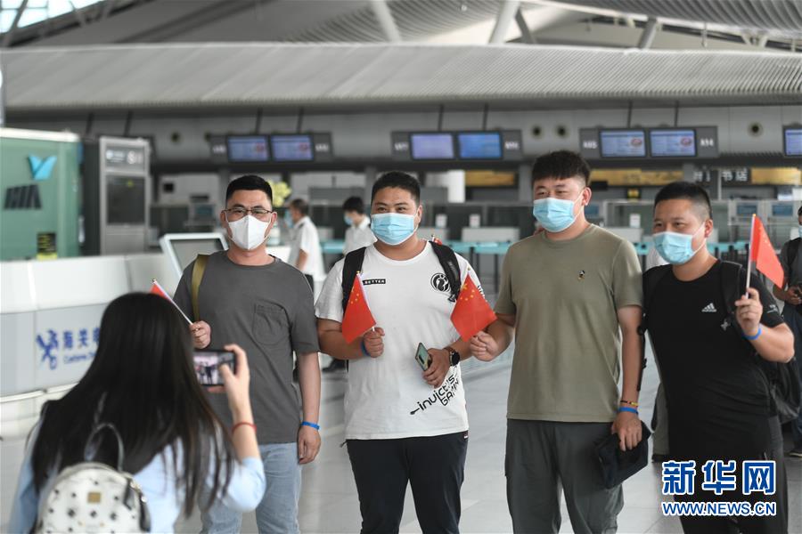 7月29日,在杭州蕭山國際機場,電力工程技術(shù)人員在進(jìn)入安檢通道前合影。當(dāng)日,中國能源建設(shè)集團浙江火電建設(shè)有限公司的113名電力工程技術(shù)人員在杭州蕭山國際機場集結(jié),啟程飛赴印度尼西亞首都雅加達(dá)。他們將重新投入到印尼多個“一帶一路”重點工程的建設(shè)中。新華社記者黃宗治攝