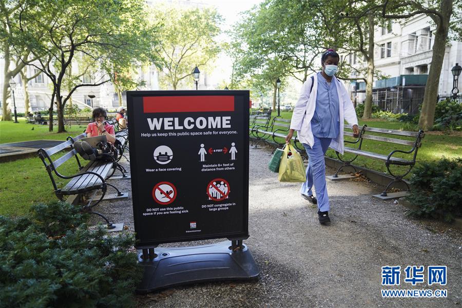 7月29日,在美國(guó)紐約,一名女子從公園內(nèi)的防疫提示牌旁走過。美國(guó)約翰斯·霍普金斯大學(xué)實(shí)時(shí)統(tǒng)計(jì)數(shù)據(jù)顯示,截至29日,美國(guó)累計(jì)新冠確診病例已超過440萬例,累計(jì)死亡病例超過15萬例。新華社記者王迎攝