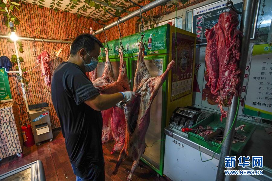 7月30日,在烏魯木齊經(jīng)濟(jì)技術(shù)開發(fā)區(qū)(頭屯河區(qū))天鵝湖社區(qū)牛羊肉直銷點(diǎn),商販在分割新鮮羊肉。新華社記者趙戈攝