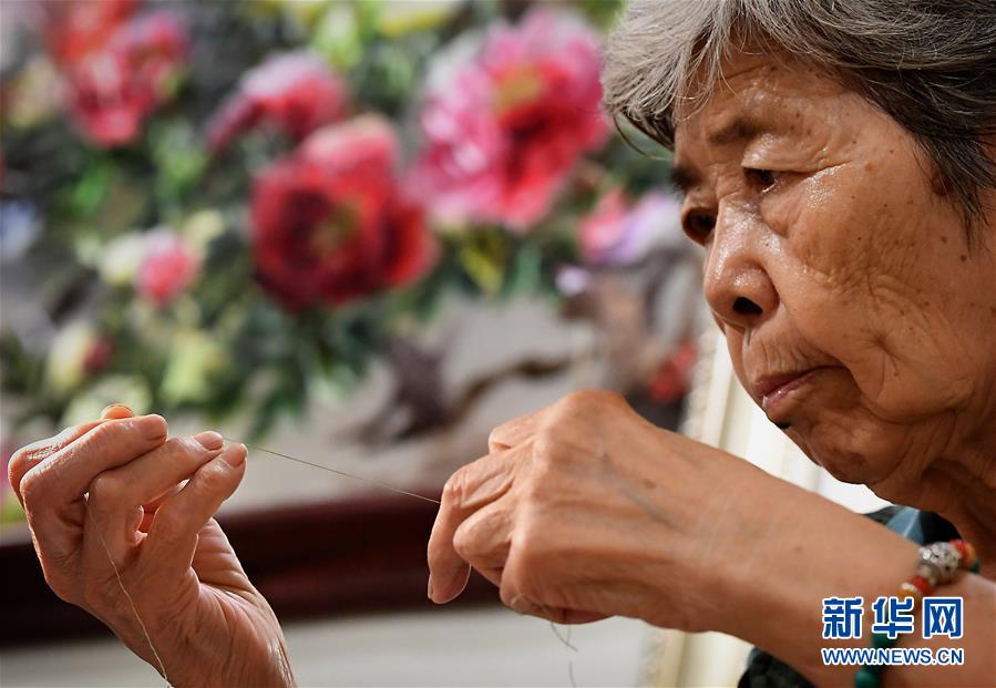 在開封市素花宋繡工藝有限公司的展示館里,王素花在刺繡(7月30日攝)。新華社記者李嘉南攝