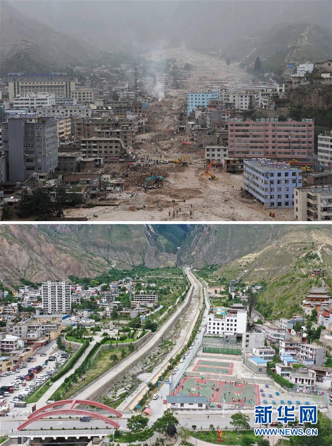拼版照片:上圖為2010年8月11日,當?shù)厝罕娫谥矍h月圓村的泥石中搜救被埋人員(新華社記者聶建江攝);下圖為2020年7月14日拍攝的月圓村山洪泥石流排導渠(新華社記者杜哲宇攝)。新華社發(fā)