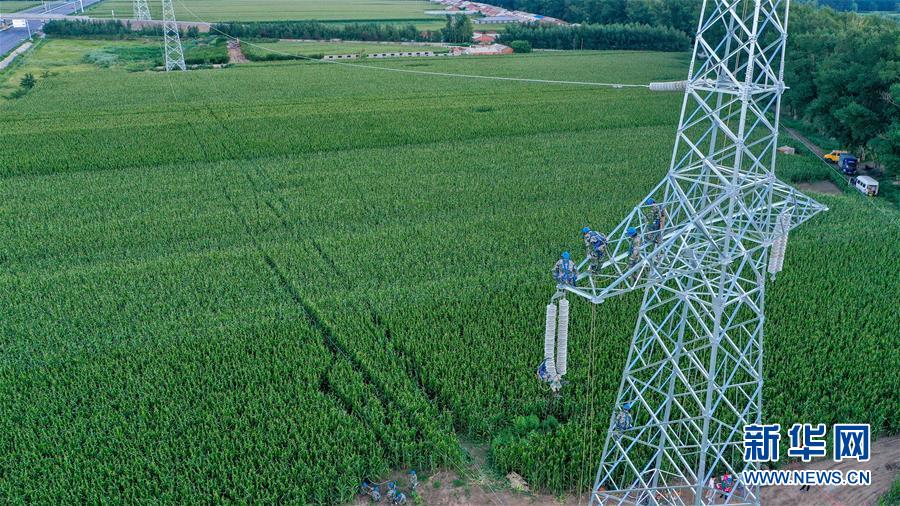 8月6日,幾名送電工在吉林省長春市城郊的一處輸電鐵塔上施工作業(yè)(無人機照片)。吉林省長春市連續(xù)多日出現(xiàn)高溫天氣,國網(wǎng)長春供電公司輸電運檢中心的送電工們每天清晨開始作業(yè),不畏烈日“烤”驗,堅守工作崗位,確保工程按計劃完成。新華社記者張楠攝
