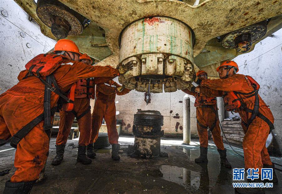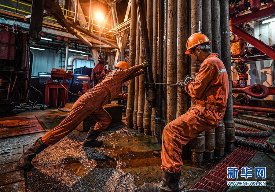 7月27日,工人在位于南海北部海域的勘探三號鉆井平臺上作業(yè)。新華社記者蒲曉旭攝