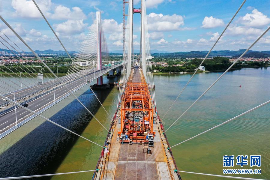 8月9日拍攝的廣州南沙港鐵路跨西江特大斜拉橋最后一塊鋼箱梁吊裝施工現(xiàn)場(無人機照片)。當日,中鐵十一局承建的粵港澳大灣區(qū)基礎設施“硬聯(lián)通”重點工程——廣州南沙港鐵路跨西江特大斜拉橋完成最后一塊鋼箱梁吊裝作業(yè),大橋即將合龍。該橋位于廣東佛山市和江門市交界處,全長1117.5米。新華社記者劉大偉攝。