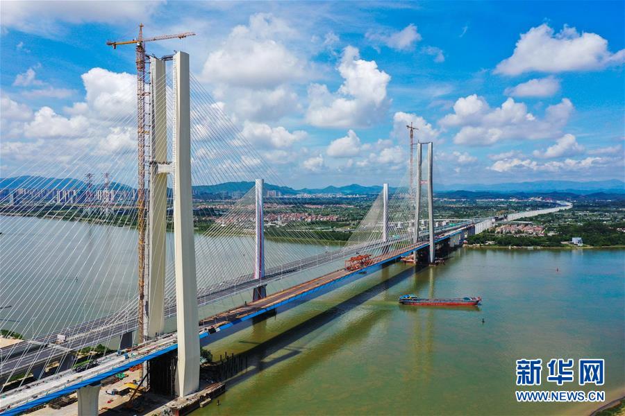 8月9日拍攝的廣州南沙港鐵路跨西江特大斜拉橋最后一塊鋼箱梁吊裝施工現(xiàn)場(無人機照片)。當(dāng)日,中鐵十一局承建的粵港澳大灣區(qū)基礎(chǔ)設(shè)施“硬聯(lián)通”重點工程——廣州南沙港鐵路跨西江特大斜拉橋完成最后一塊鋼箱梁吊裝作業(yè),大橋即將合龍。該橋位于廣東佛山市和江門市交界處,全長1117.5米。新華社記者劉大偉攝。