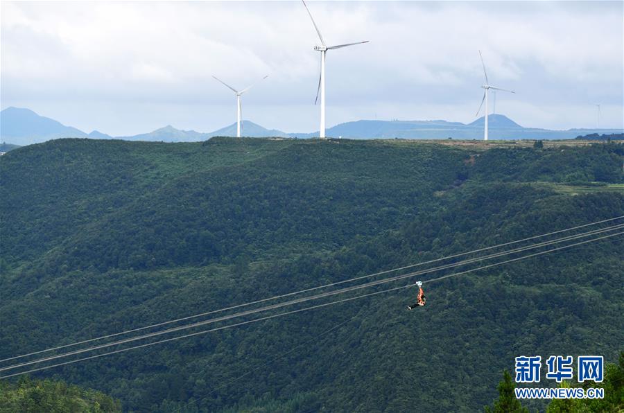 8月8日,游客在貴州省龍里油畫(huà)大草原乘坐滑索觀光。近日,貴州省黔南布依族苗族自治州龍里縣境內(nèi)氣候宜人,龍里油畫(huà)大草原、“龍門(mén)鎮(zhèn)”武俠文化主題景區(qū)等景點(diǎn)吸引眾多游客前來(lái)觀光旅游。新華社記者楊文斌攝。