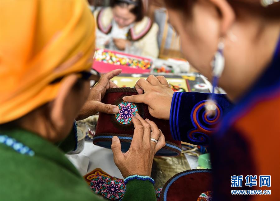 在內蒙古自治區(qū)鄂溫克族自治旗巴彥托海鎮(zhèn)太陽花傳承發(fā)展中心,艾吉瑪(右)和手工藝人交流制作工藝(8月6日攝)。新華社記者劉磊攝。