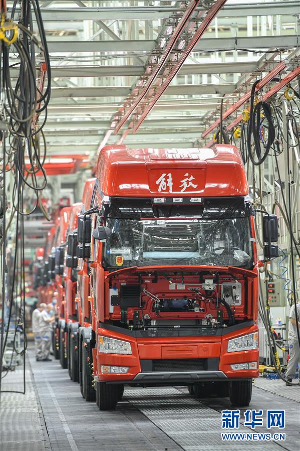 8月10日,在位于長春市的一汽解放總裝車間,工人在裝配車輛。中國第一汽車集團有限公司7月銷售整車32.2萬輛,同比增長23.2%,延續(xù)上半年的增長態(tài)勢。新華社記者張楠攝。