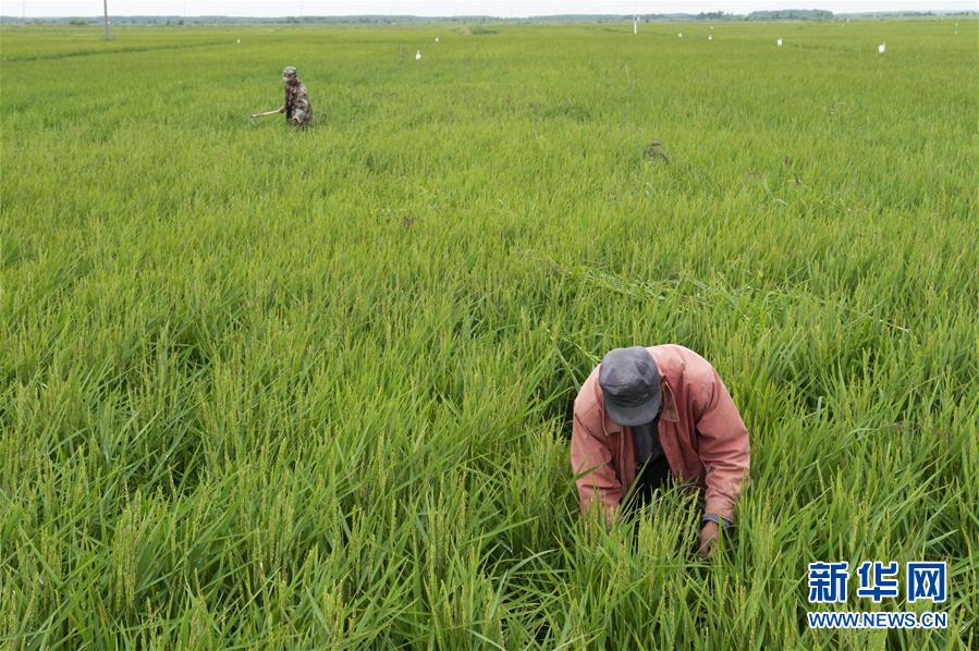 8月11日,農(nóng)民在撫遠(yuǎn)市一處稻田中清除雜草。時下,“華夏東極”黑龍江省撫遠(yuǎn)市的水稻長勢良好,蒼翠的稻田一望無際,猶如綠毯鋪在大地上。新華社記者謝劍飛攝。