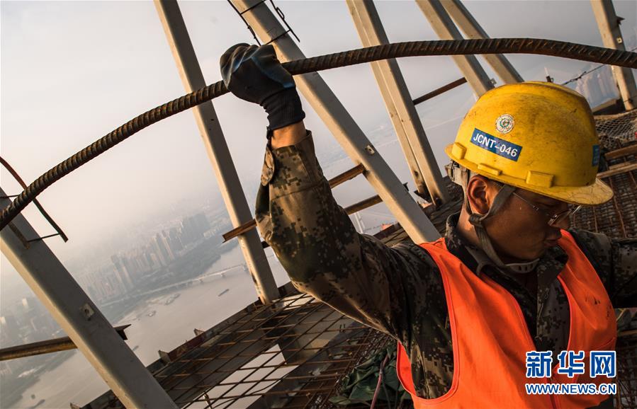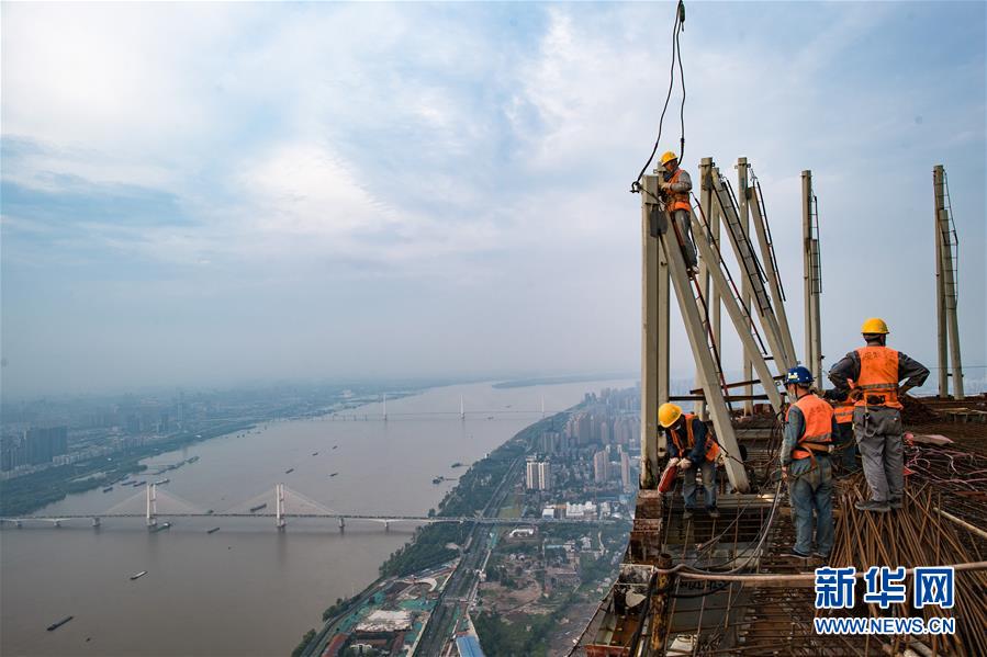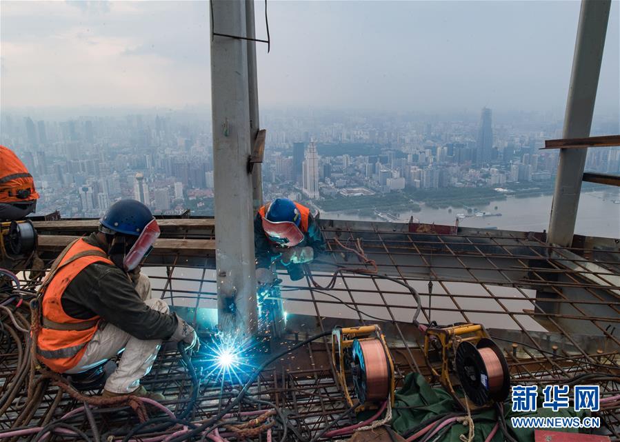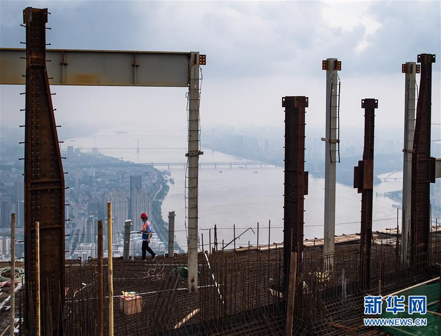 8月11日,工人在武漢綠地中心項(xiàng)目建設(shè)現(xiàn)場近500米的高空施工。新華社記者肖藝九攝