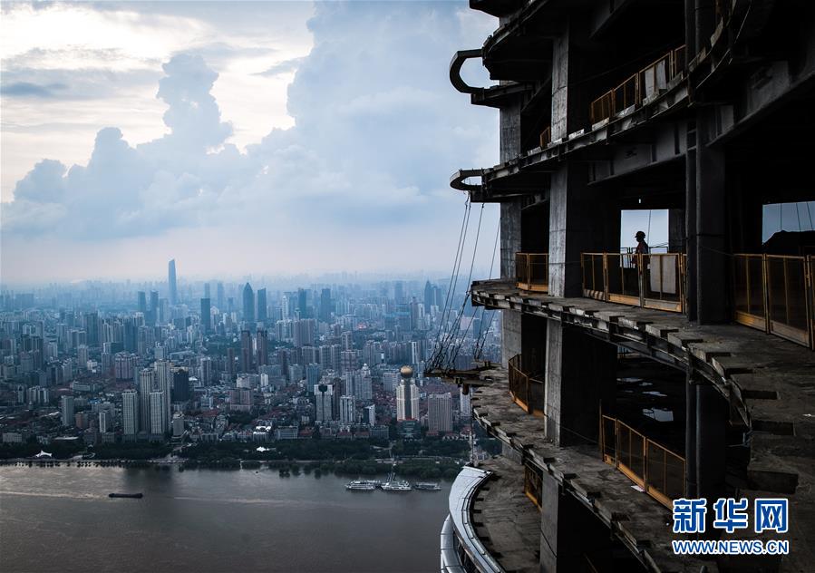 8月11日,一名工人在武漢綠地中心項(xiàng)目建設(shè)現(xiàn)場近500米的高空遠(yuǎn)眺。新華社記者肖藝九攝