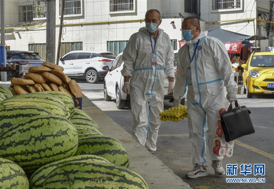 8月12日,烏魯木齊市天山區(qū)山西巷社區(qū)工作人員王志鷹(右)在社區(qū)物資保障點(diǎn)前詢問(wèn)水果銷(xiāo)售情況。新華社記者 高晗攝