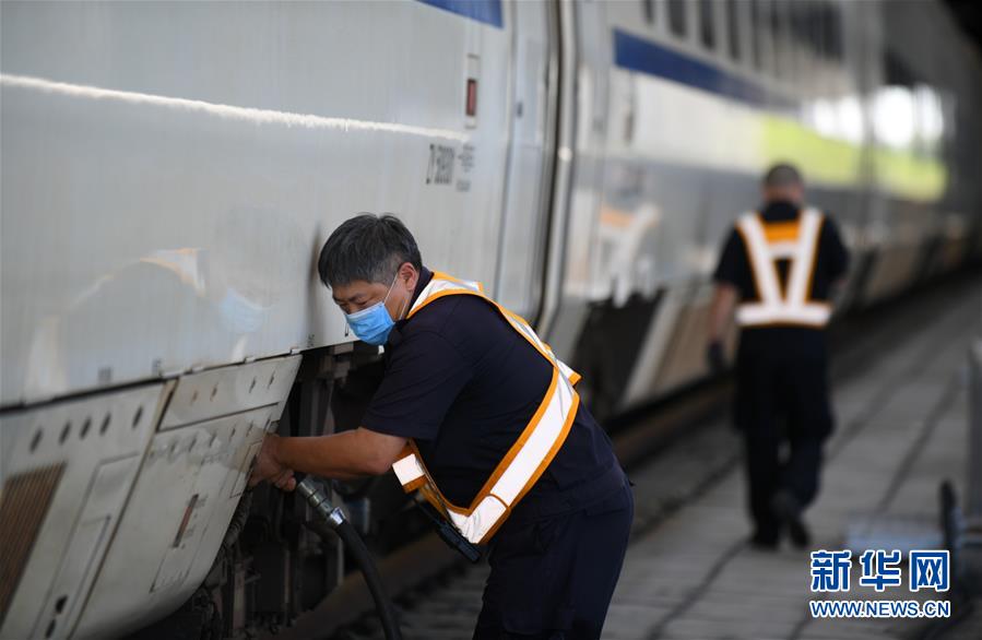 8月12日,長春火車站客運(yùn)車間上水工王軍在給列車上水。進(jìn)入暑運(yùn)高峰,為了保障列車正常用水,每當(dāng)一列火車??寇囌?,長春火車站的上水工就冒著酷暑將水管插進(jìn)火車底部的輸水口,快速準(zhǔn)確完成輸水作業(yè)。新華社記者 林宏 攝