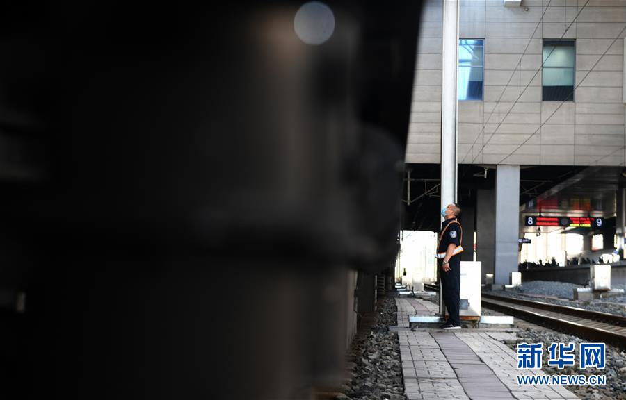 8月12日,長(zhǎng)春火車(chē)站客運(yùn)車(chē)間上水工韓冰等候列車(chē)停站。新華社記者 林宏 攝