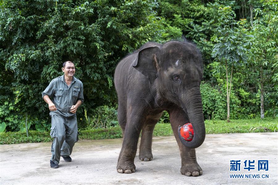 8月12日,在西雙版納傣族自治州亞洲象種源繁育及救助中心,救助象“羊妞”在生日會上與一名“象爸爸”玩皮球。新華社記者 陳欣波 攝