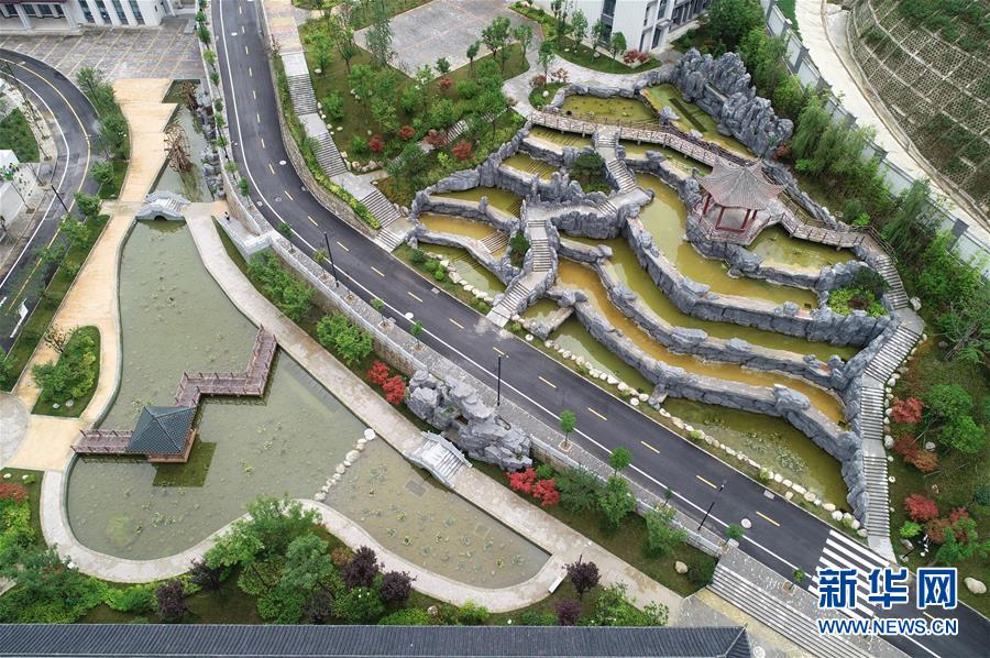 鎮(zhèn)安縣鎮(zhèn)安中學(xué)多級(jí)瀑布群與水池棧道涼亭景觀(7月30日攝,無(wú)人機(jī)照片)。新華社記者邵瑞攝