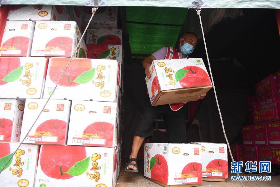 商戶(hù)在新發(fā)地批發(fā)市場(chǎng)周轉(zhuǎn)新區(qū)卸下蘋(píng)果(8月6日攝)。 新華社記者 張晨霖 攝
