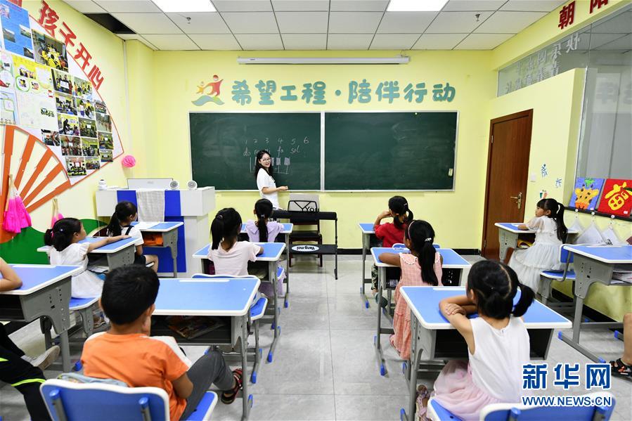 8月13日,在貴州省思南縣雙塘街道麗景社區(qū)易地扶貧搬遷安置點(diǎn),志愿者在給孩子們上音樂課。今年暑假期間,在貴州省銅仁市思南縣雙塘街道麗景社區(qū)易地扶貧搬遷安置點(diǎn),來自北京有研集團(tuán)和思南當(dāng)?shù)氐闹驹刚邆兝檬钇跁r(shí)間,給安置點(diǎn)的孩子們進(jìn)行音樂、體育、手工、安全教育等課程輔導(dǎo),幫助搬遷戶照看孩子,讓孩子們在學(xué)習(xí)中度過一個(gè)快樂而有意義的暑假。新華社記者楊文斌攝