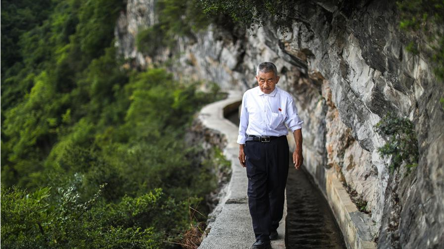 貴州遵義播州區(qū)團結(jié)村老支書黃大發(fā)沿著修建在絕壁上的“大發(fā)渠”巡查。