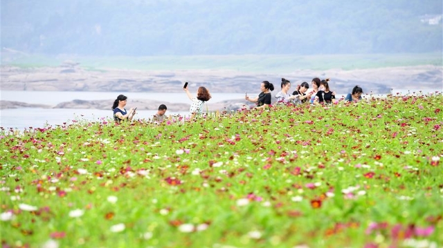 近日,重慶市巴南區(qū)木洞鎮(zhèn)長江岸邊的格桑花競相開放,吸引游客前來賞花觀景。