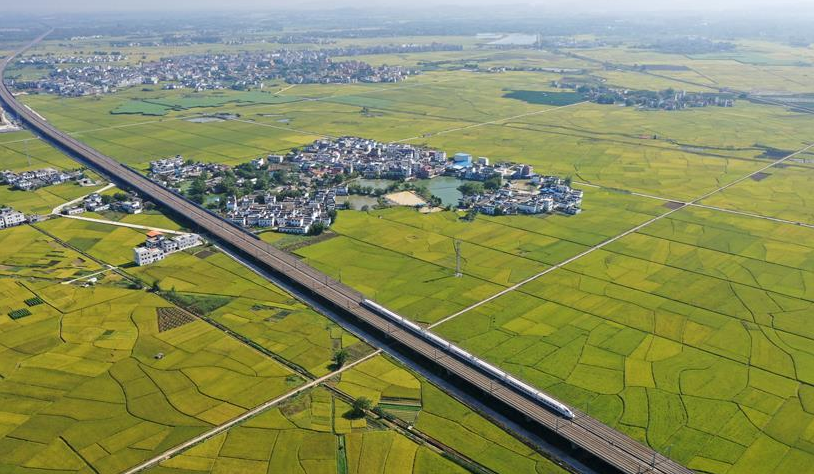 眼下,廣西賓陽縣古辣鎮(zhèn)大面積稻田進(jìn)入收獲期,一列列南來北往的動車從稻田間飛馳而過,構(gòu)成一幅幅美麗的豐收圖畫。
