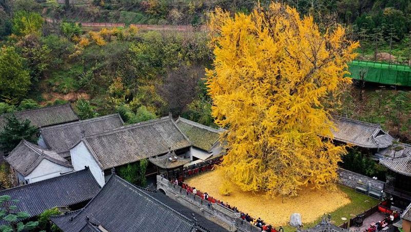 初冬時(shí)節(jié),陜西省西安市長安區(qū)羅漢洞村終南山古觀音禪寺內(nèi)的千年銀杏樹滿目金黃,落葉宛如金毯,吸引游客前來參觀游覽。