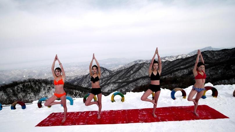 1月30日,河南欒川伏牛山滑雪場內(nèi),幾名比基尼美女寒冬天氣里在山頂練瑜伽、泡溫泉。