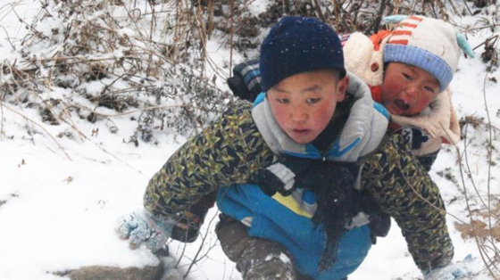 日,大涼山深處,雪下得正緊。9歲半的吉覺吉竹背著1歲半的弟弟,沿著陡峭崎嶇的山路,在零下十一攝氏度的氣溫中冒雪前行。媽媽背著更重的竹簍,跟在吉覺吉竹身后。