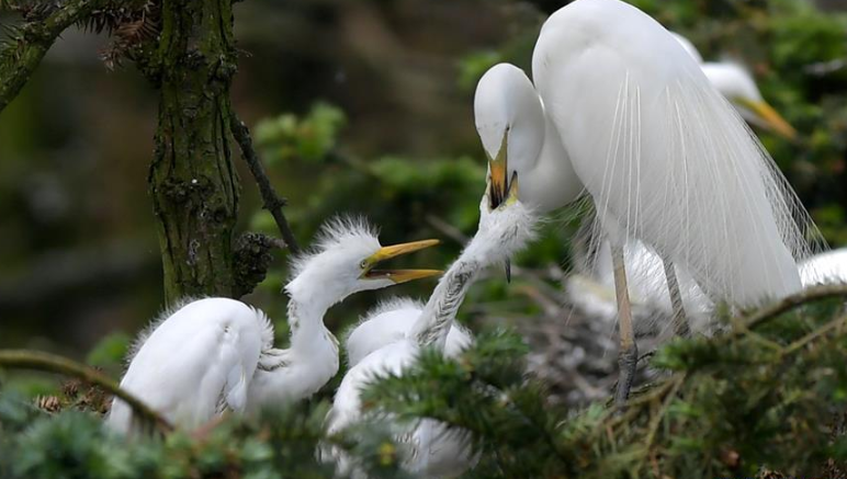 近日,在江西省南昌市新建區(qū)象山森林公園內(nèi),已安家筑巢的大批鷺鳥陸續(xù)孵化出了后代。