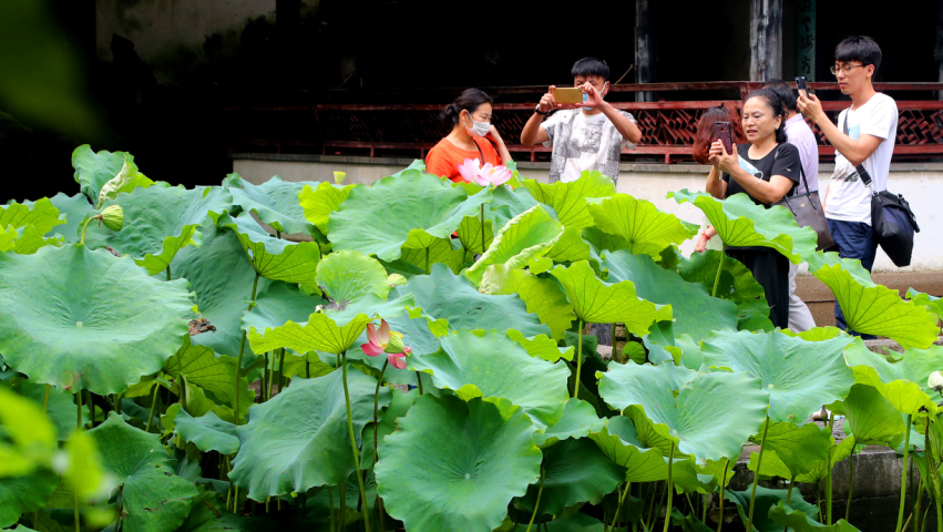 2020年7月18日,許多游客在塘荷疊翠的蘇州古典園林拙政園消夏暑游。