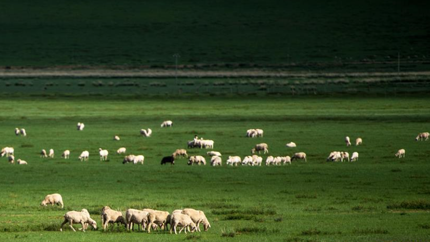 7月18日,羊群在內蒙古錫林郭勒盟正鑲白旗境內的草原上覓食。