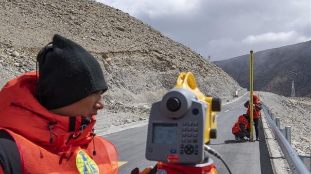 近日,國測一大隊隊員在日喀則市定日縣曲當鄉(xiāng)境內進行水準測量。
