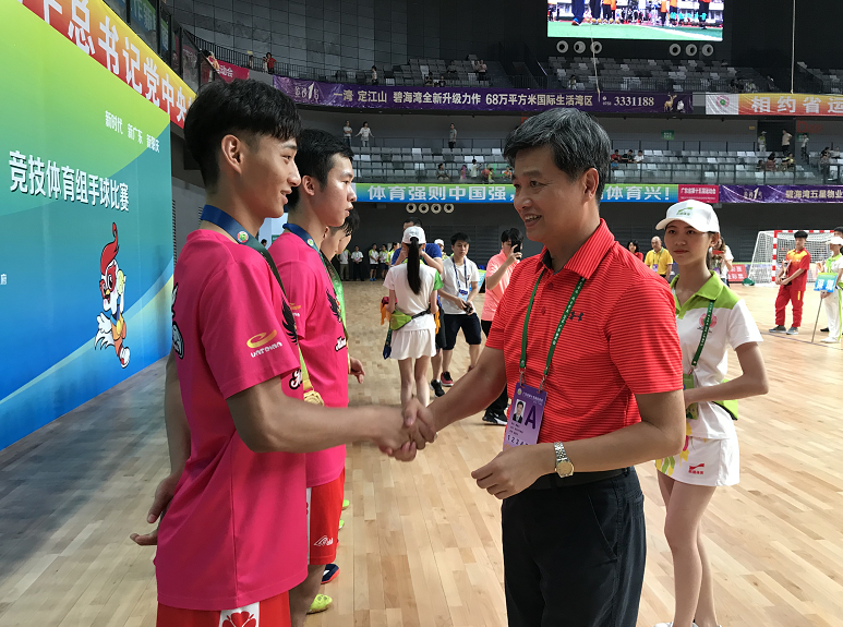 深圳新聞網(wǎng)訊 繼20日結(jié)束的高爾夫球賽奪冠后,深圳代表隊在廣東省運(yùn)會再下一金。7月21日,在為期5天的肇慶男子青少年組手球比賽中,深圳手球隊以35∶29打敗廣州隊奪得了冠軍,這是深圳男子手球隊在省運(yùn)會上獲得的第一個五連冠,也是深圳代表團(tuán)獲得的第一個集體項(xiàng)目金牌。深圳文體旅游局副局長韓星元現(xiàn)場為深圳男子青少年手球隊頒發(fā)金牌。