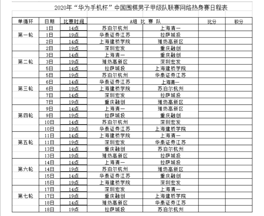 附:2020年“華為手機(jī)杯”中國圍棋男子甲級隊(duì)聯(lián)賽網(wǎng)絡(luò)熱身賽日程表