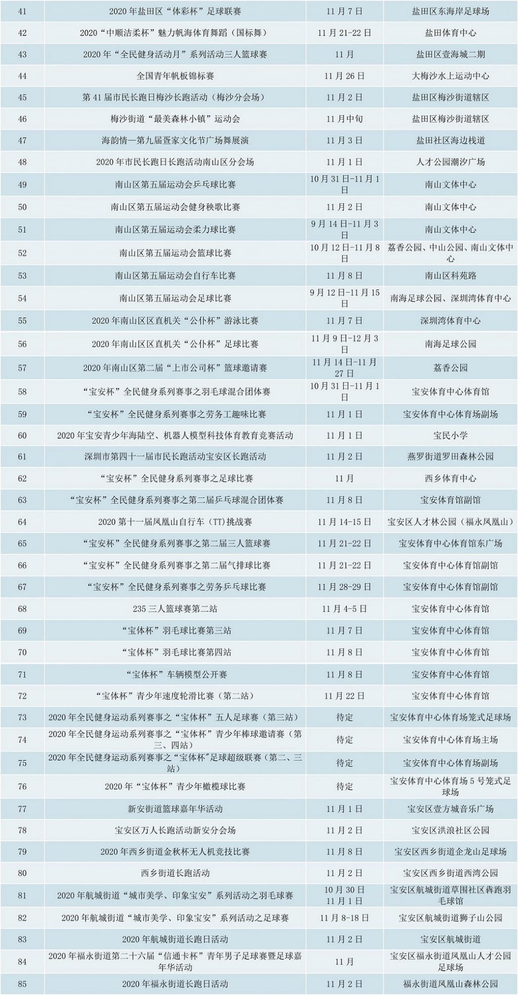 附2020年深圳全民健身活動(dòng)月期間賽事活動(dòng)表: