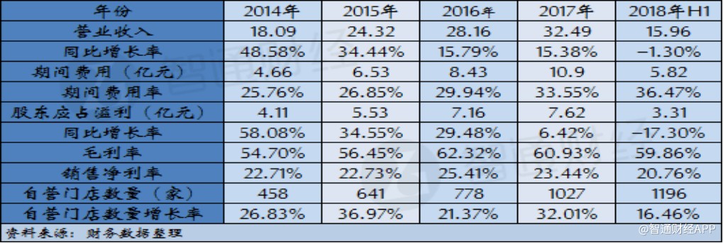 根據(jù)智通財經(jīng)APP的梳理,周黑鴨自營門店數(shù)量在2014年為458家,此后三年公司自營門店數(shù)量每年都有超過20%的增長,但期間公司營業(yè)收入增幅卻呈現(xiàn)放緩的趨勢。與此同時,公司門店數(shù)量的增長也帶來費(fèi)用率逐年提升,截至2017年,公司期間費(fèi)用率達(dá)到33.55%,以至于公司凈利潤增速同比下滑超過23個百分點(diǎn)。公司2018年中期財報顯示,上半年公司門店數(shù)量凈增長169家,較2017年增長16.46%,門店數(shù)量快速增長的勢頭雖然的已延續(xù),但卻支撐不起公司營收繼續(xù)保持增長,同時公司期間費(fèi)用率進(jìn)一步提升至36.47%,導(dǎo)致盈利水平大幅下滑。