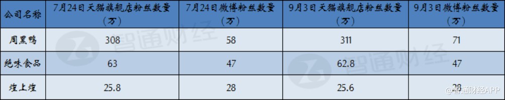 智通財經(jīng)APP曾在7月24日統(tǒng)計得到周黑鴨在當(dāng)天的天貓旗艦店粉絲數(shù)量為308萬,是其他兩大鹵制品公司的數(shù)倍,截至9月3日,周黑鴨天貓旗艦店的粉絲數(shù)量已經(jīng)增長至311萬,反觀絕味和煌上煌不僅沒有增長反而有小幅下滑。此外,周黑鴨微博粉絲數(shù)量在9月3日也增長至71萬較7月27日增長了13萬,而其他兩家公司的微博粉絲數(shù)量還在原地踏步。
