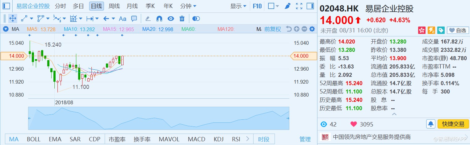 中國房地產(chǎn)行業(yè)正站在拐點上,行業(yè)集中度將進一步提升,存量市場成為各路資本的新戰(zhàn)場,“服務生”易居在資源及戰(zhàn)略布局上已做好充分準備,上半年的成績或許只是新的起點。8月31日,易居股價收漲4.63%,報14港元。