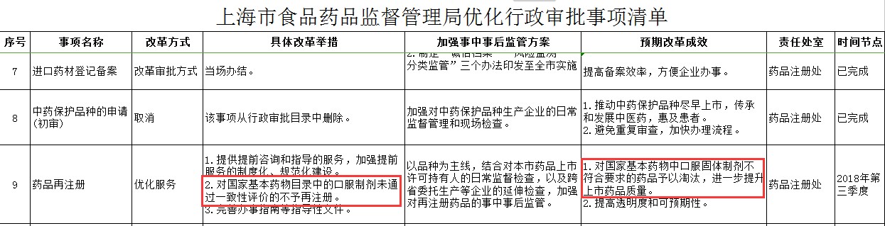 在清單“藥品再注冊(cè)”事項(xiàng)中,明確“加強(qiáng)對(duì)再注冊(cè)藥品的事中事后監(jiān)管”“對(duì)國(guó)家基本藥物目錄中口服制劑未通過(guò)一致性評(píng)價(jià)的不予再注冊(cè)”“對(duì)國(guó)家基本藥物中口服固體制劑不符合要求的藥品予以淘汰”。