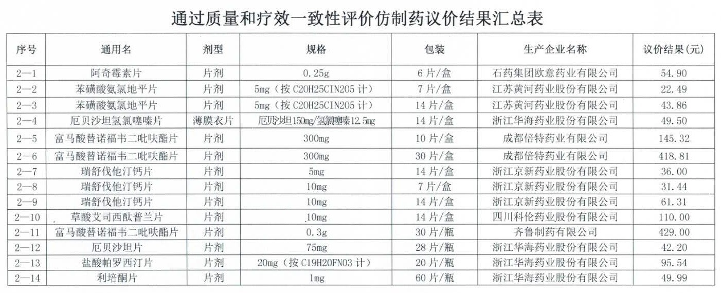 在議價(jià)的品種中,通過(guò)一致性評(píng)價(jià)全部議價(jià)成功的14個(gè)藥品包括石藥(01093)歐意的阿奇霉素片、江蘇黃河的苯磺酸氨氯地平片、浙江華海的厄貝沙坦片、京新藥業(yè)的瑞舒伐他汀鈣片、科倫藥業(yè)的草酸艾司西酞普蘭片、成都倍特和齊魯制藥的富馬酸替諾福韋二吡呋酯片等。