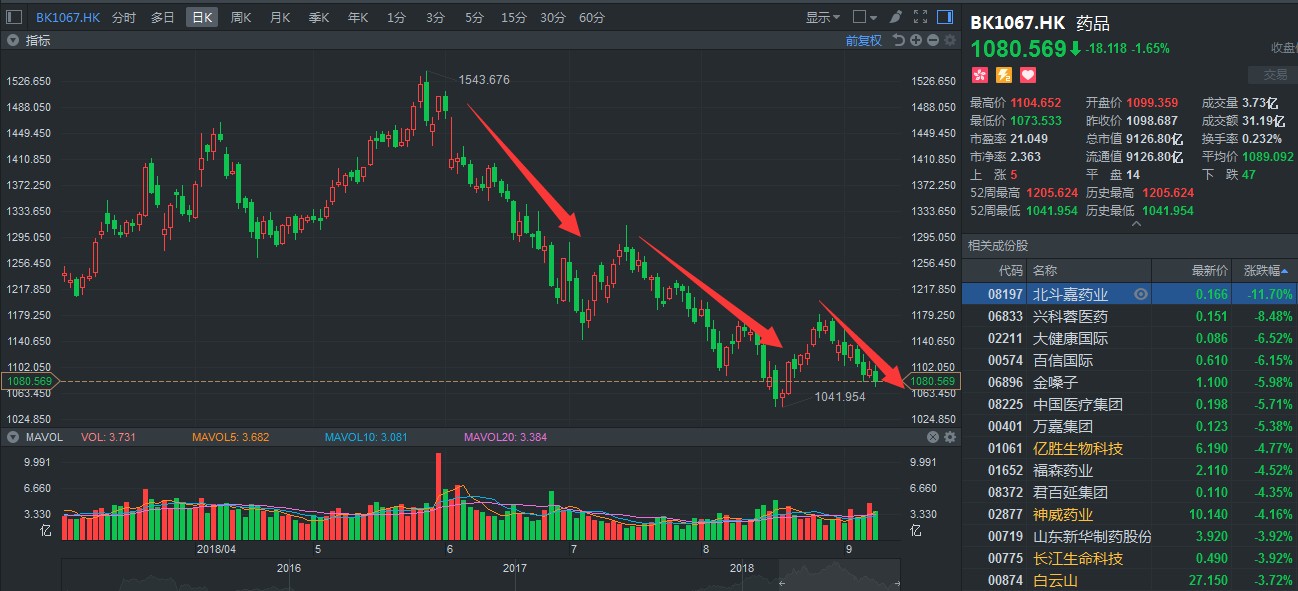 據(jù)智通財(cái)經(jīng)APP觀察,截至9月10日,上證跌了1.21個(gè)點(diǎn);恒指跌幅超過(guò)1.33%,50只成分股,僅包括九龍倉(cāng)置業(yè)(01997)在內(nèi)的6只股票小范圍飄紅,而醫(yī)藥板塊方面,繼續(xù)下挫,普遍以“掛綠”收盤(pán),大勢(shì)可謂慘不忍睹。