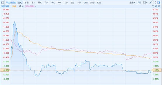 正式納入港股通的平安好醫(yī)生也明顯受到拖累。如果平安好醫(yī)生的分時(shí)圖和恒生指數(shù)的分時(shí)圖疊加,可以看出,平安好醫(yī)生早段有有迅速?zèng)_高的勢(shì)頭,但隨后受到大市的影響而轉(zhuǎn)跌,此后走勢(shì)與大盤(pán)幾乎同步。不過(guò),平安好醫(yī)生走勢(shì)相對(duì)穩(wěn)健,最終僅跌1.15%,跑贏恒指,報(bào)價(jià)42.85港元,成交額1777萬(wàn)港元。