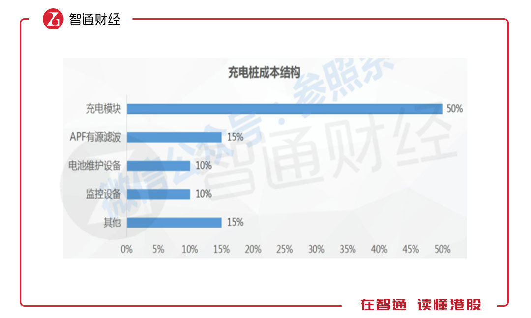充電樁的上游是零部件的供應商,主要為電池維護設備、充電模塊、監(jiān)控設備等,而充電樁的成本構成中,充電模塊占比達50%,充電模塊、監(jiān)控設備及電池維護設備合計成本占比達到70%,是充電樁的核心成本。
